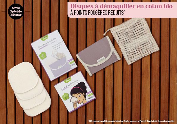 Si vous êtes hôtesse sur la période du 30 octobre au 31 décembre 2017, vous aurez le privilège de bénéficier des disques à démaquiller en coton bio à points fougères réduits**.