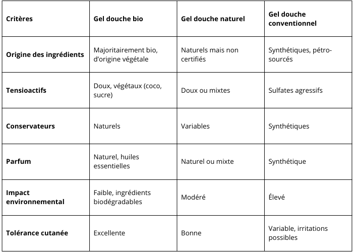 Tableau comparatif : Gel douche bio, naturel, conventionnel