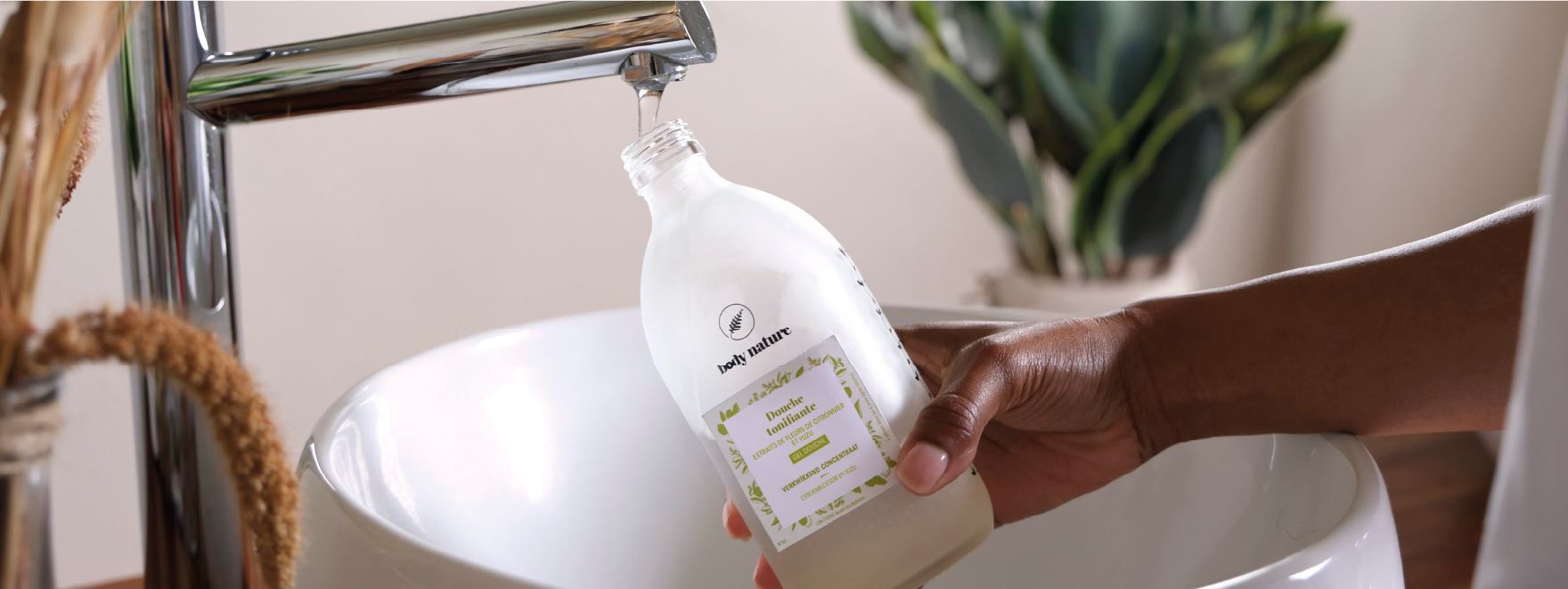 Les gels douche Body Nature se versent directement dans un flacon rechargeable et réutilisable, en verre ou en plastique selon votre préférence.