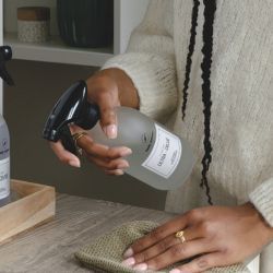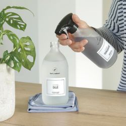 Prenez un flacon rechargeable et collez l’étiquette « Dilution entretien » sur la face avant. Dans votre flacon rechargeable, versez 500 ml d’eau tiède. Complétez avec 12 pulvérisations de solution pure de Propre et homogénéisez la dilution en agitant légèrement. À utiliser dans le mois. Produit ménager économique : un flacon de 500ml de dilution entretien du Propre vous revient à 0.31€*.